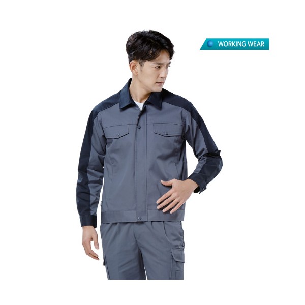 그레이색상에 네이비 포인트를 준 깔끔한 디자인의 작업복 (생활방수 통기성 스트레치 O)